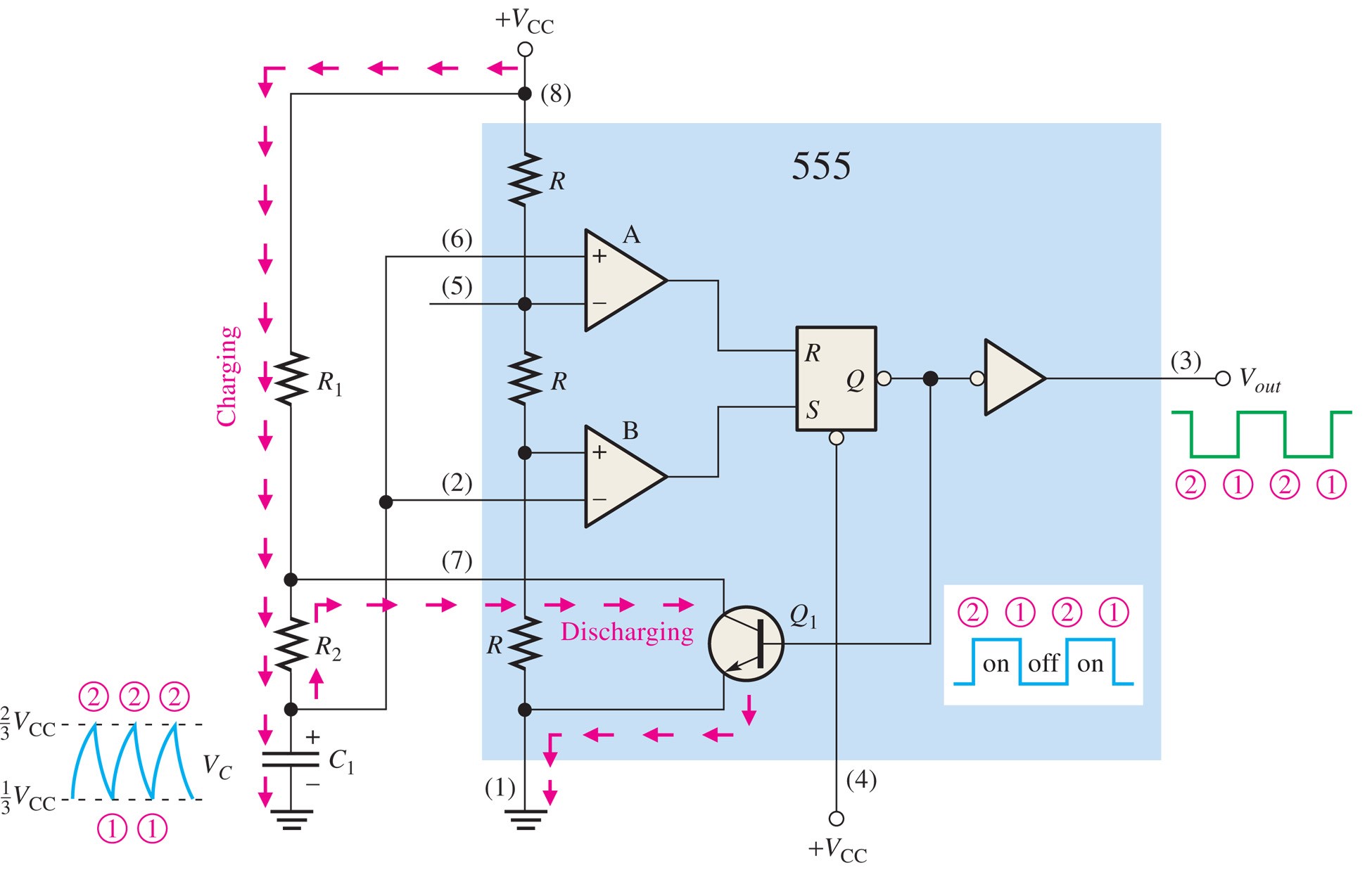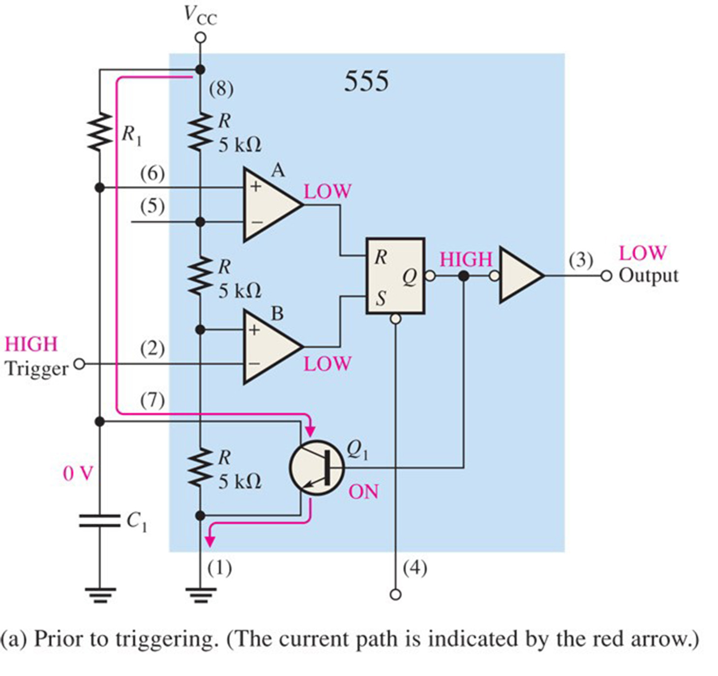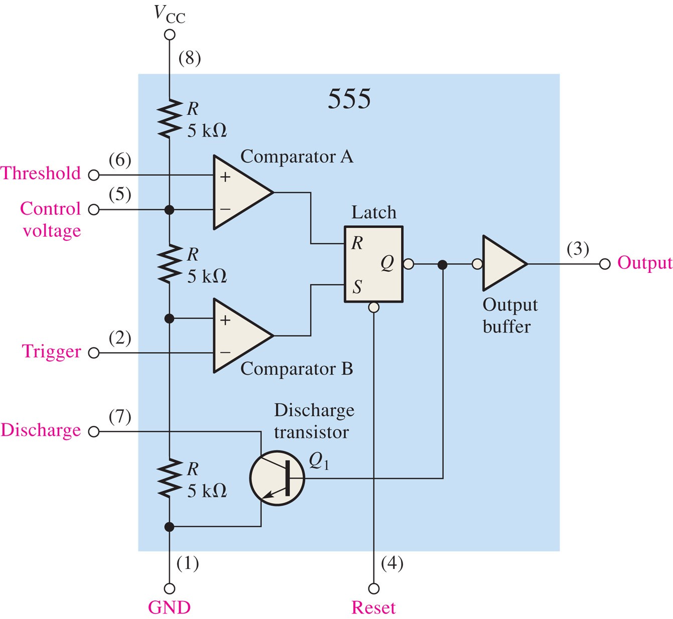 We will be using the versatile 555 timer as both a monostable multivibrator (one-shot) and an astable multivibrator (oscillator). The internals of a 555 IC is shown below.