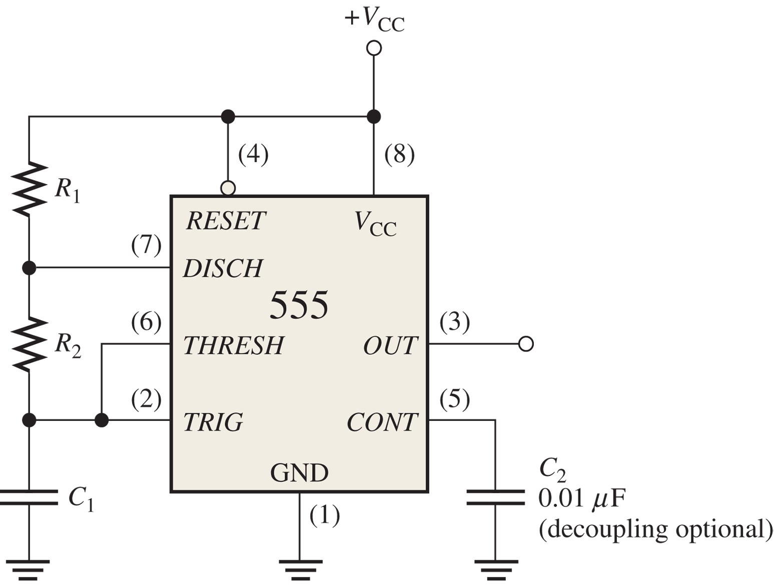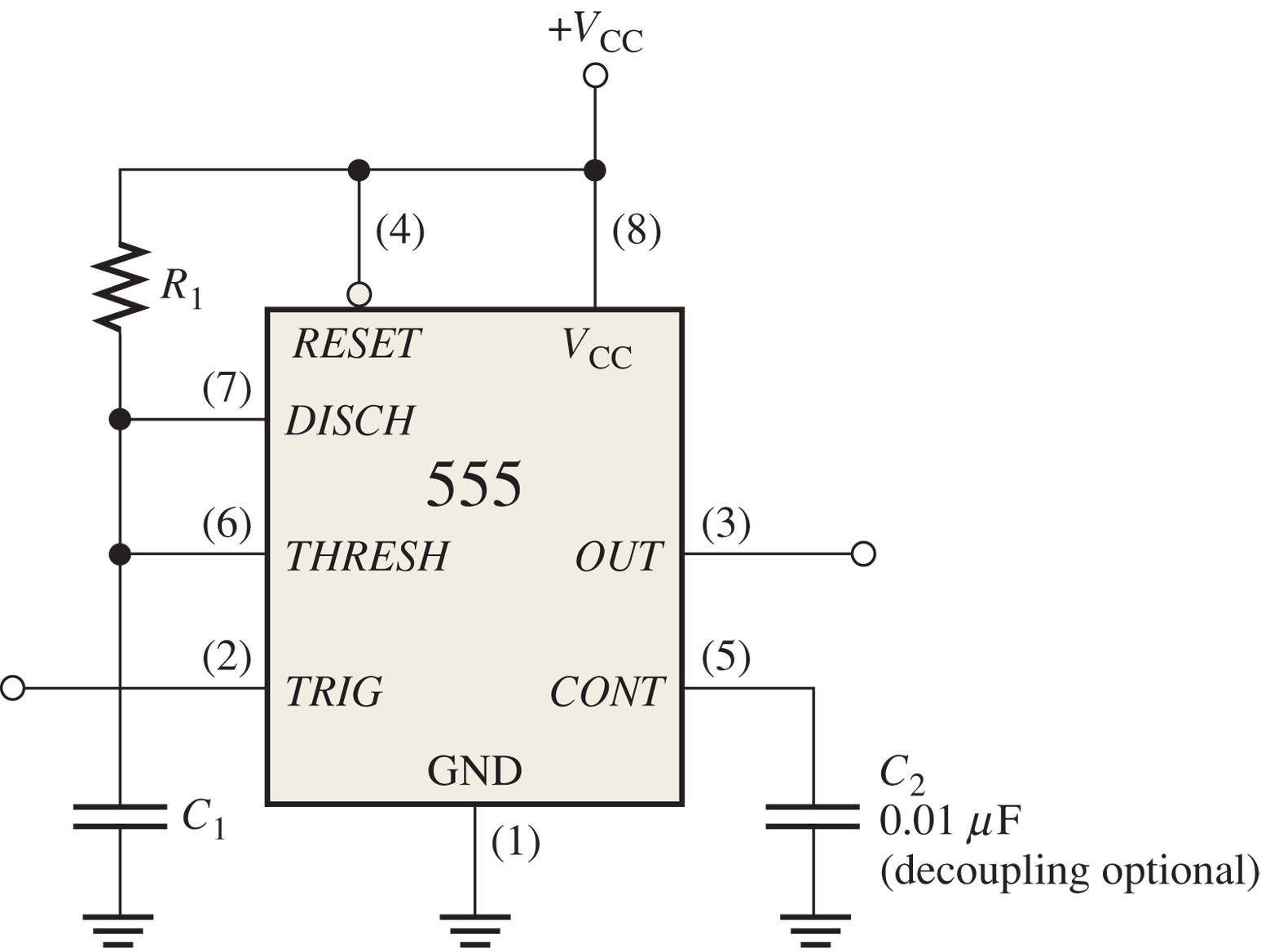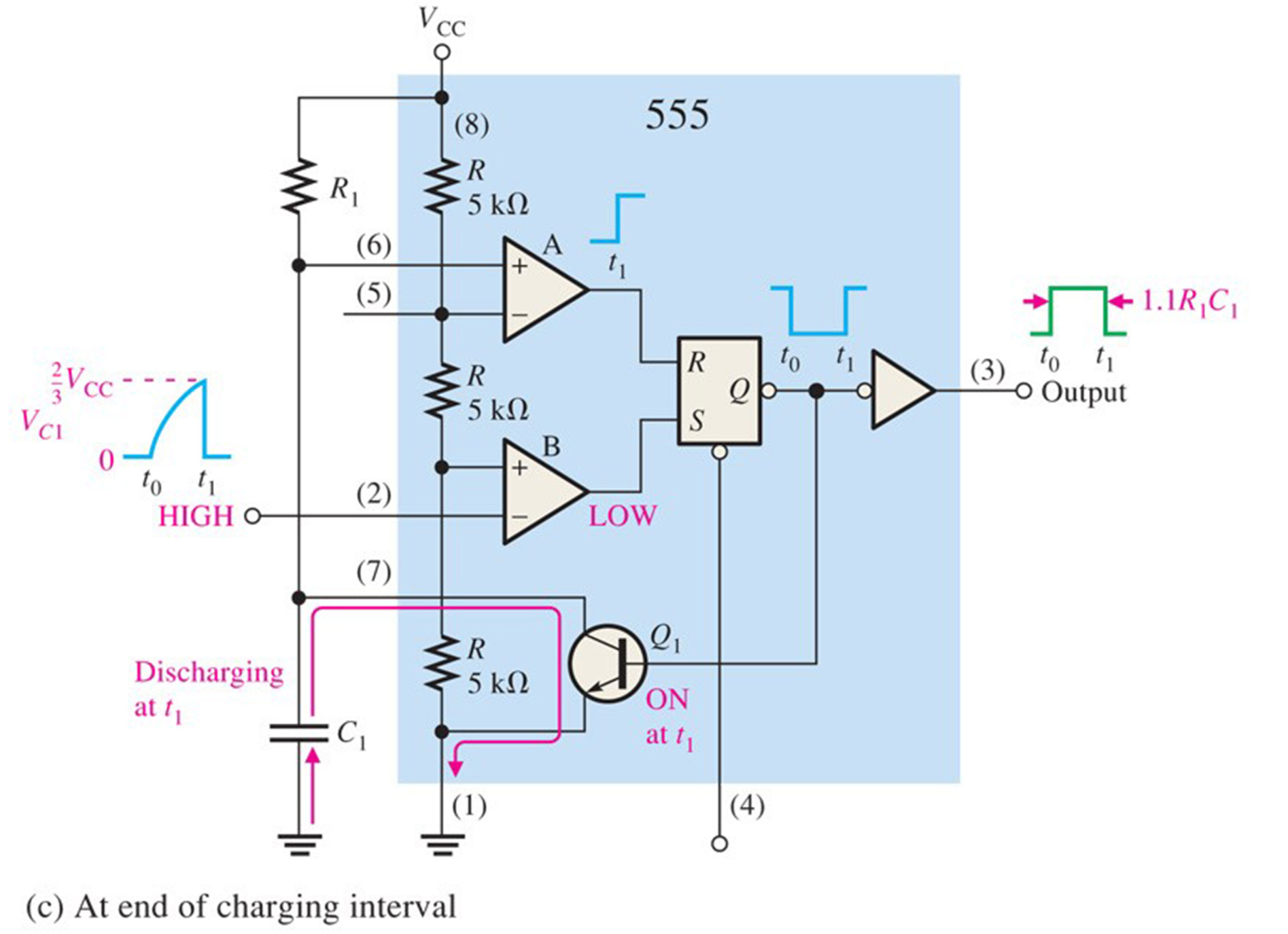 We will be using the versatile 555 timer as both a monostable multivibrator (one-shot) and an astable multivibrator (oscillator). The internals of a 555 IC is shown below.