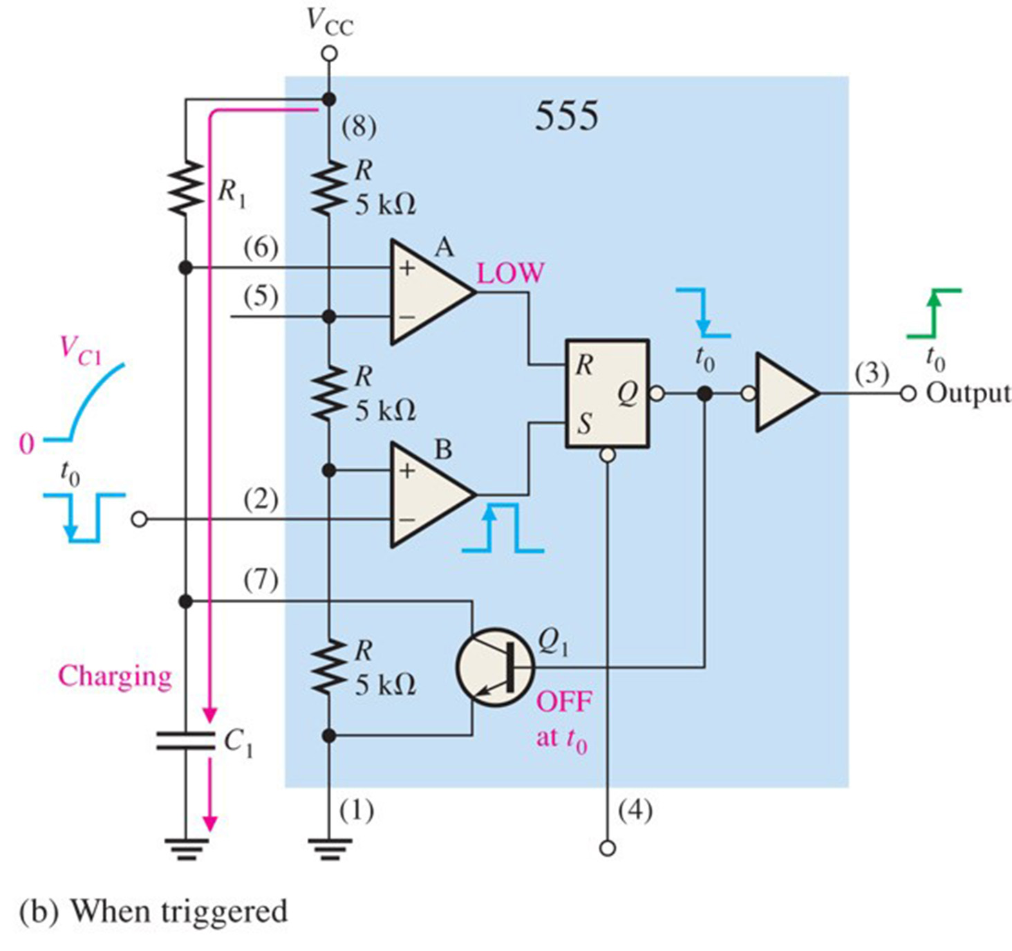 When triggered, it will set the internal R-S latch, which consequently enables the circuit to charge the capacitor.
