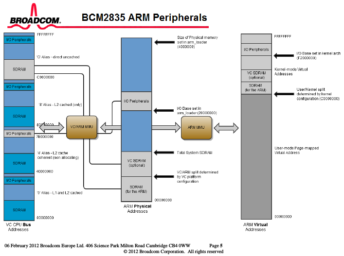 The thing to look for here is the I/O Peripherals (which includes the GPIO pins) and notice that there are three information entries - 0xF2000000 on the ARM Virtual Address, 0x20000000 on the ARM Physical Address (noted as set by arm_loader) and 0x7E000000 on the Video Core CPU Bus Address. You need these information to access the I/O peripherals.